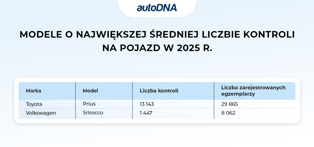 Dwa najczęściej kontrolowane w Polsce modele w 2025 roku to Toyota Prius i Volkswagen Scirocco. Użytkownicy japońskiej hybrydy doświadczyli ponad 13,1 tys. kontroli (na prawie 30 tys. zarejestrowanych w kraju egzemplarzy). Niemiecki kompakt zwrócił uwagę mundurowych ponad 1400 razy (na 8 tys. przedstawicieli tego modelu poruszających się po polskich drogach).