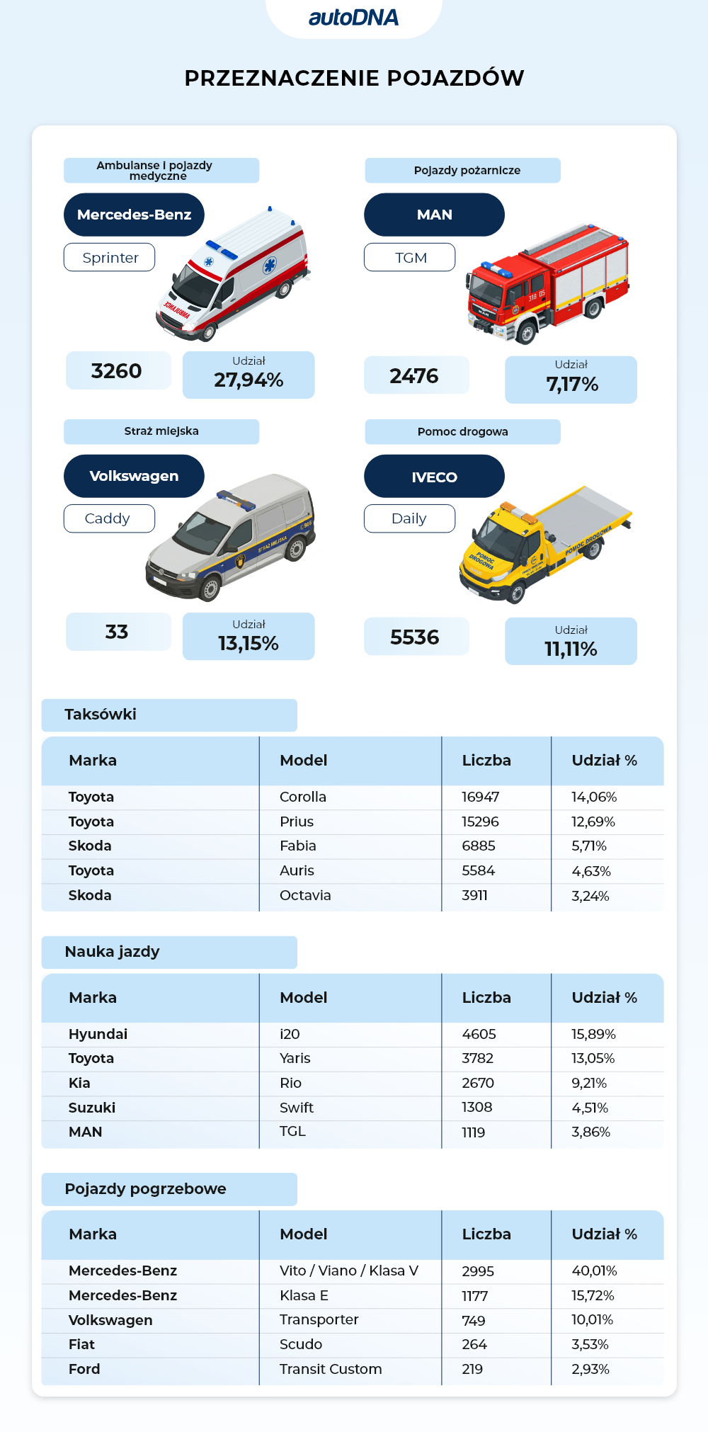 Niemal co trzecia karetka w Polsce to Mercedes-Benz Sprinter. Wozy strażackie budowane są najczęściej na bazie MANa TGM. Pomoc drogowa jeździ najchętniej Iveco Daily, straż miejska – Volkswagenem Caddy.