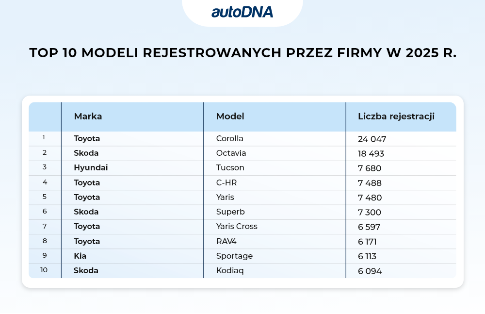 Zestawienie samochodów najchętniej kupowanych i rejestrowanych przez firmy zdominowane zostało przez Toyotę oraz Skodę, ale w pierwszej dziesiątce miejsce znaleźli też dwaj koreańscy producenci. Przoduje oczywiście Toyota Corolla (ponad 24 tys. firmowych rejestracji w 2025 roku), za nią znalazła się Skoda Octavia (niecałe 18,5 tys. egzemplarzy). Na trzecim miejscu uplasował się Hyundai z modelem Tucson. W jego przypadku sprzedaż była już wyraźnie niższa – 7 680 sztuk.